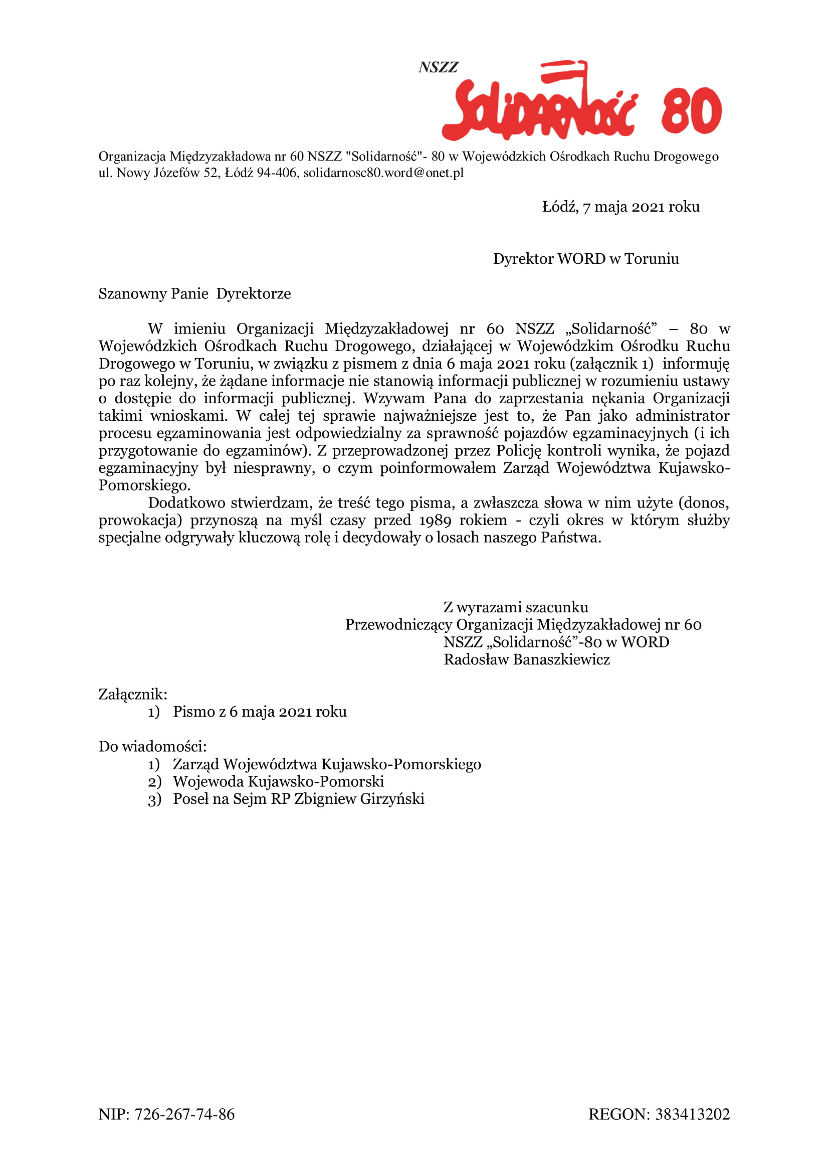 Niewiarygodny wniosek o informację publiczną. Bardziej przypominający działania Służb Bezpieczeństwa przed 1989 roku niż wniosek o informację publiczną. Kto?, kiedy?, skąd?. Nieważny jest fakt, że pojazd był niesprawny i Policja zabrała dowód. Nieważne, że być może działania Policji uratowały komuś życie. Autorowi pisma (Dyrektorowi WORD w Toruniu) pomyliły się chyba czasy. Informujemy więc, że Komuna już upadła i żyjemy w Polsce demokratycznej. Powstaje jednak pytanie: skąd tendencja do formułowania takich zapytań? Będziemy sprawdzać.