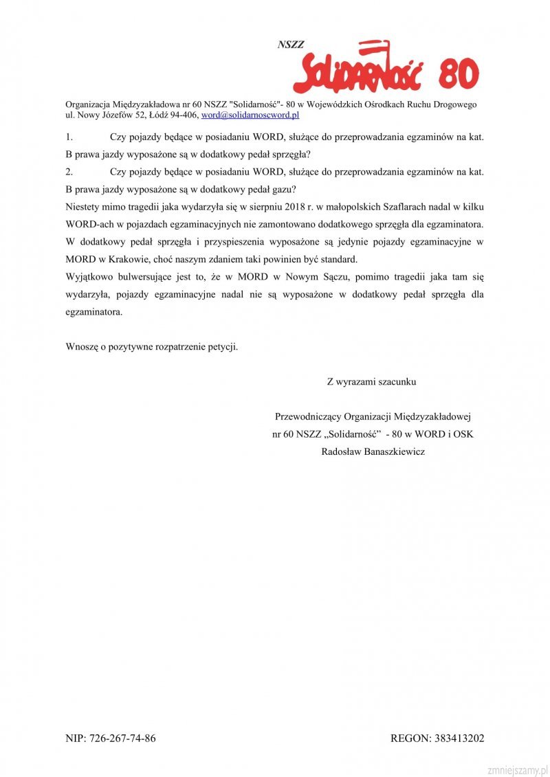 Dlaczego tak jest, że w MORD Kraków można zamontować po stronie egzaminatora dodatkowy pedał sprzęgła i gazu a w MORD Nowy Sącz nawet po tym tragicznym wypadku dyrektor Ośrodka nie zdecydował się na montaż dodatkowych pedałów dla egzaminatorów. To jest tym bardziej niewiarygodne w zestawieniu z faktem, że MORD Nowy Sącz ma kilkanaście milionów oszczędności. Tak to przykład dbania o bezpieczeństwo ruchu drogowego, bezpieczeństwo egzaminatorów oraz kandydatów na kierowców.