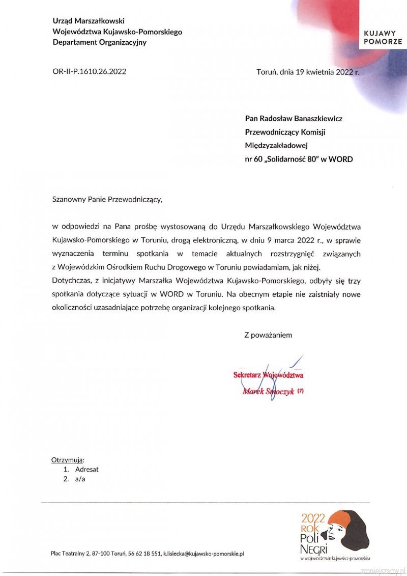 Po trzecie trudno się dziwić postępowaniu Dyrektora WORD w Toruniu skoro jego przełożony w taki sposób traktuje naszą Organizację;